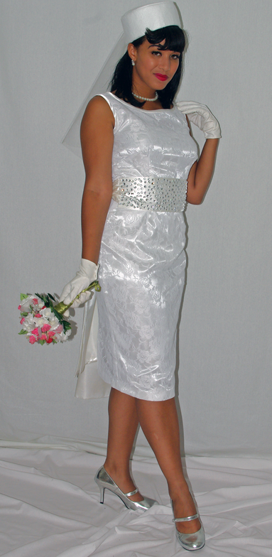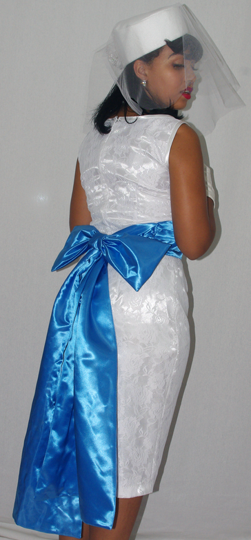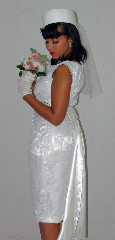 Perfect for a modest, intimate wedding or a genteel garden party, the April Mae is versatile, delicate, and sophisticated. The dress consists of a white satin wiggle dress with white lace overlay, and a removable cummerbund-inspired waistband with bow back. wear it with the waistband for added grandeur or wear the dress by itself for an understated glam look, either way you'll look to die for!